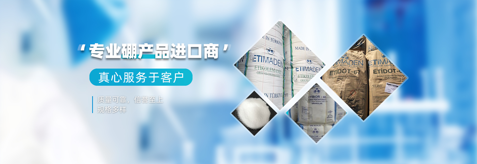 公司主要代理進口土耳其ETI公司硼產品(進口四水八硼酸鈉、進口五水硼砂、進口速溶硼、十水硼砂、硼鈣石、硼酸、無水硼砂) , 及其他國家進口硼產品。種類齊全,批發價格合理,品質保證,庫存充足。